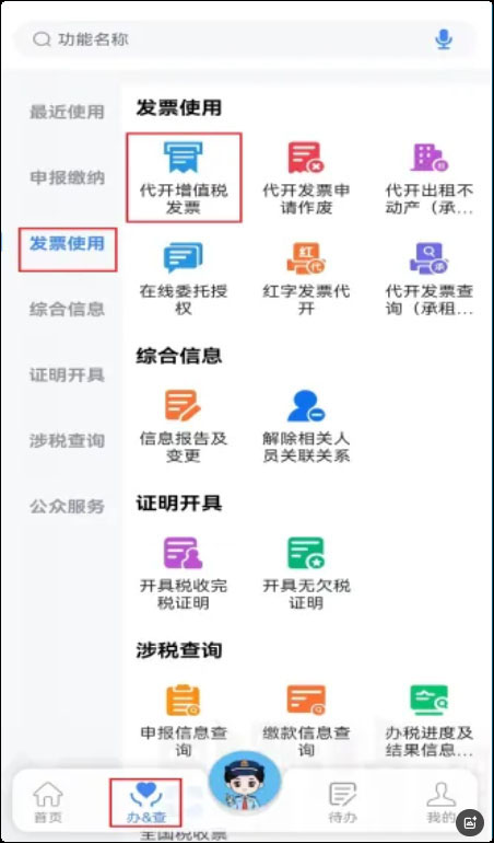 1、点击【办&查】-【发票使用】-【代开增值税发票】-【代开发票查询】查询待开具发票。