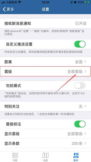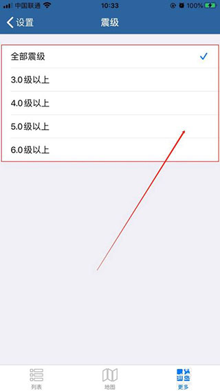 7.在“震级”的列表界面中,选择全部震级或多少级以上即可。