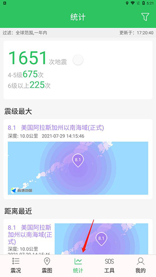 3、地震统计:统计指定时间段和范围内的历史地震记录,了解不同震级发生次数、离您最近的地震和震级最大地震。