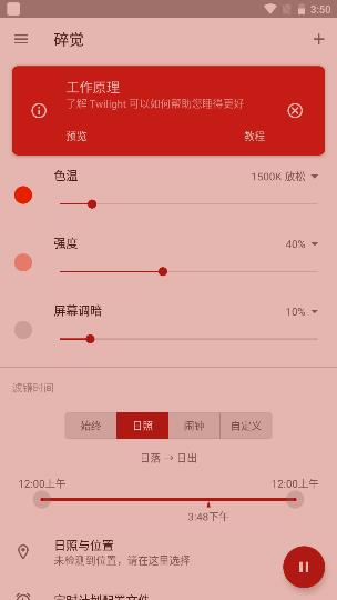 薄暮微光「Twilight」应用使您的手机/平板设备屏幕自动调节适应一天中的时间。它会在日落后过滤掉您手机或平板电脑屏幕上的蓝色光谱,并以柔和而悦目的红色滤镜来保护您的眼睛。滤镜的强度会根据您所在地日出与日落时间的日照周期而平滑地自动调节。