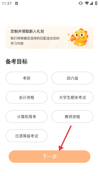 1、选备考目标,点【下一步】进入APP首页。