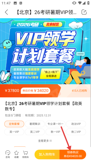 3、在课程详情页,点【领券购买】,按流程购课学习。