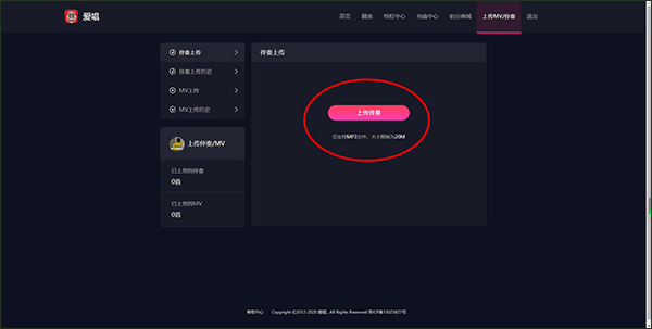 2、登录好自己的账号后进入到上传界面,点击上传伴奏。