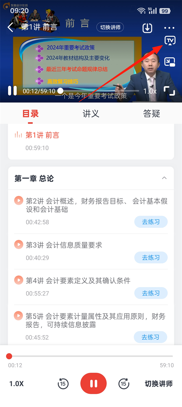 2、点击观看要投屏的学习视频,然后点击投屏图标