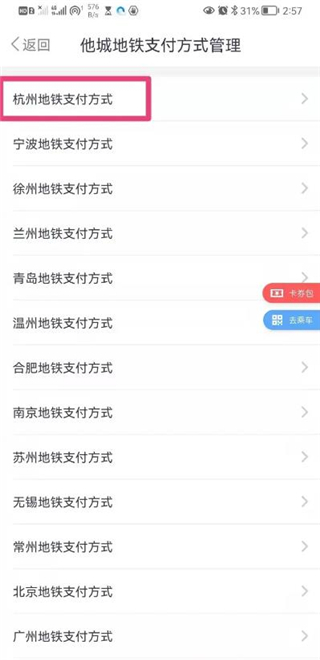 2、进入新页面,选择要开通的城市去开通地铁支付方式即可。