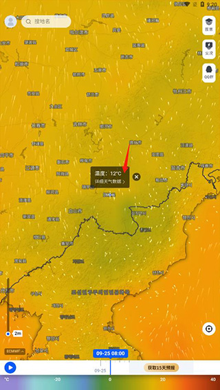 7、滑动屏幕,将准心移动至想查看的地区,也能快速知道其他地区的温度;