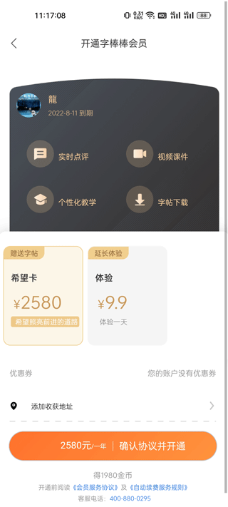 练字棒棒收费为一年2580元并送字帖,体验会员为9.9一天,开通会员后,里面的内容不再额外收费,全部免费使用,新用户登录会送一星期会员体验