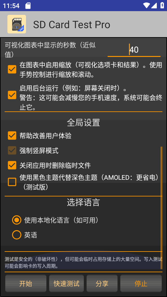 很经典好用的一款SD速度测试工具,SD Card Test Pro安卓免费版,解锁了专业功能,打开就可以直接使用,无论是手机上自带的sd卡还是外部的sd卡存储和传输速度都可以测试,支持几种不同的组合进行测试,有需要的可直接下载。