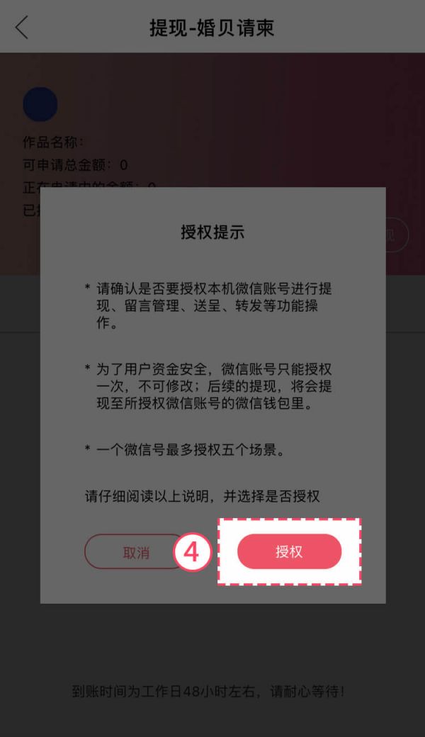 第二步:点击④处【授权】按钮,并关注“婚贝网”微信公众号后,返回APP点击【提现】按钮即可提现。