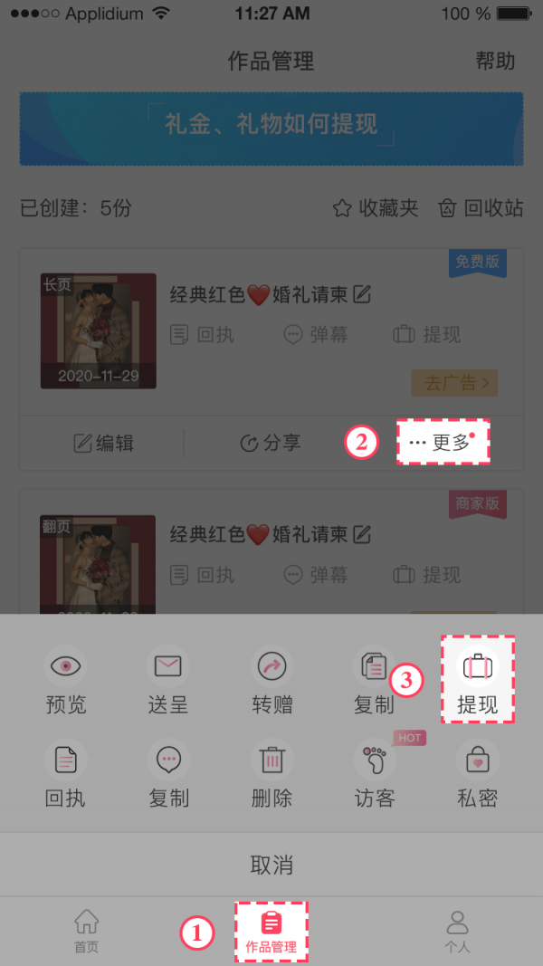 第一步:点击①处【作品管理】按钮,点击②处【...更多】按钮,点击三③处【提现】按钮。