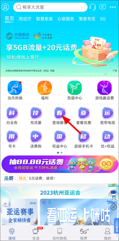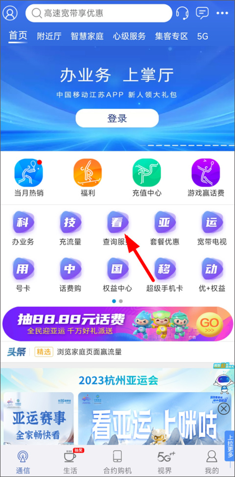 1、用户在本站下载中国江苏移动app,打开并登录进入通信首页,用户在首页可查看附近营业厅、办业务、充流量等,点击查询服务;