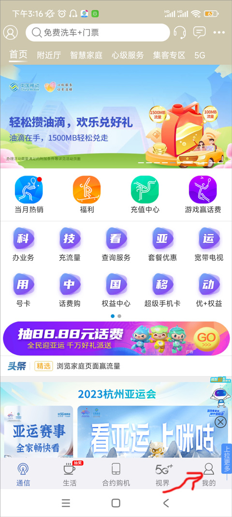 1、用户打开中国江苏移动app,登录进入首页,点击右下角我的打开;