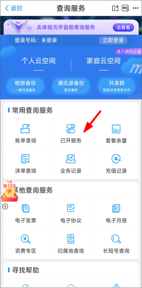 2、进入查询服务页面,用户可以查看套餐余量、账单查询、电子发票查询等,点击已开业务;