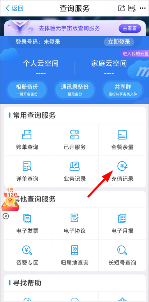 2、打开查询业务页面,用户在常用查询服务栏下找到充值记录;