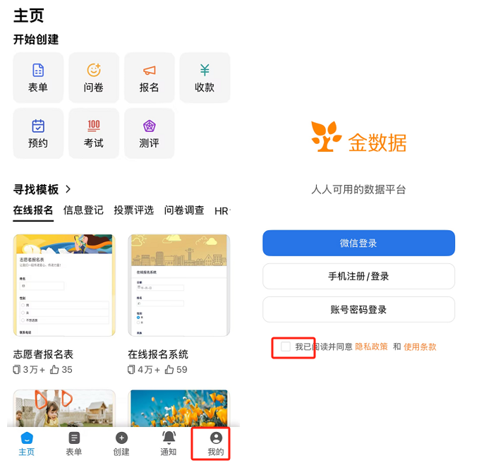 下载金数据App后,进入App需点击「同意并继续」并勾选「我已阅读并同意使用条款、隐私政策和使用规范」,选择使用场景,再点击底部「我的」,登录金数据账号才能使用。