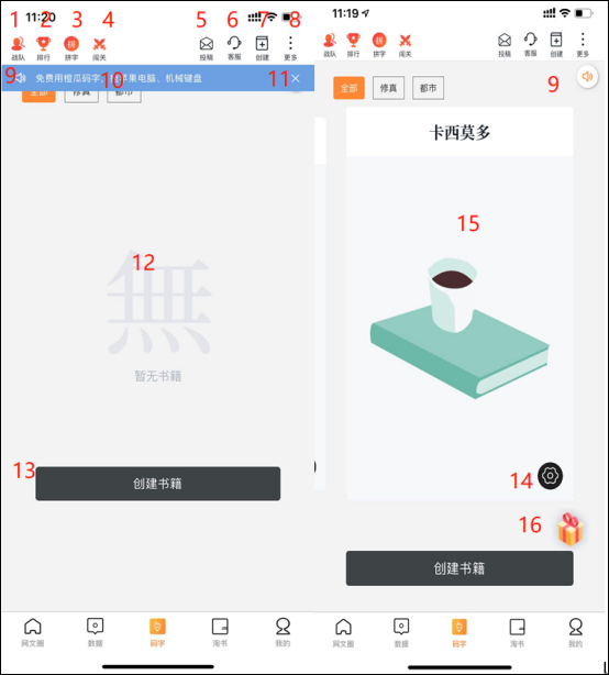(15)数字15 为创建的书籍展示,如果有多本书籍,左右滑动可切换书籍;\