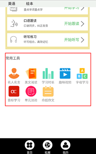 3、页面最底端,有各种常用小工具,名人名言,美文阅读,字母学习等功能来帮助孩子学习