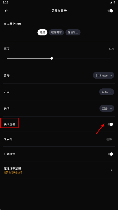 3、最后开启“关闭屏幕”即可息屏显示。