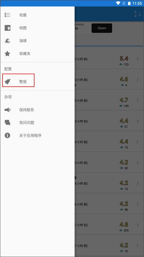 1、打开app之后默认进入到【地震】界面,点击左上角的三横图标。
