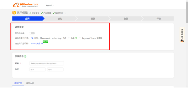 第二步:选择 是否样品单、支付方式、交易币种