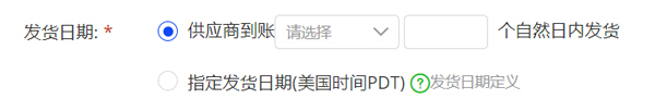 c. 发货日期:可以指定发货日期或选择收齐预付款/尾款后N个自然日内发货。(注意:填写发货日期时,请将周末和节假日时间加入,且填写确定的日期数,请勿使用about30-35这样的字眼,系统会按照最少的日期计算发货日期)