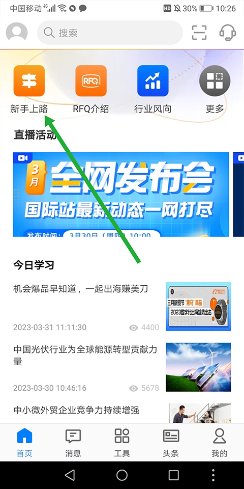 1、打开并登录阿里卖家手机版,进入首页后点击【新手上路】