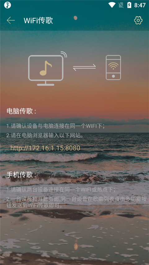 3、APP内WiFi传歌界面的右上角设置按钮可自己选择歌曲保存路径,其中传歌方式可分为电脑传歌和手机传歌两种。