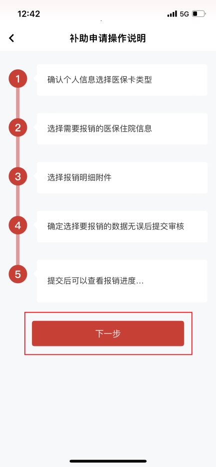 8.社保卡类型选择“二代卡”,点击“下一步”,核对住院数据,勾选需要报账的住院数据。注意!!!同一年度多次住院的,住院数据必需一起勾选进行补助申请,勾选后,点击“提交”。 (全自费费用超过一万元需要上传单据,点击“报销明细附件”,拍照上传。)