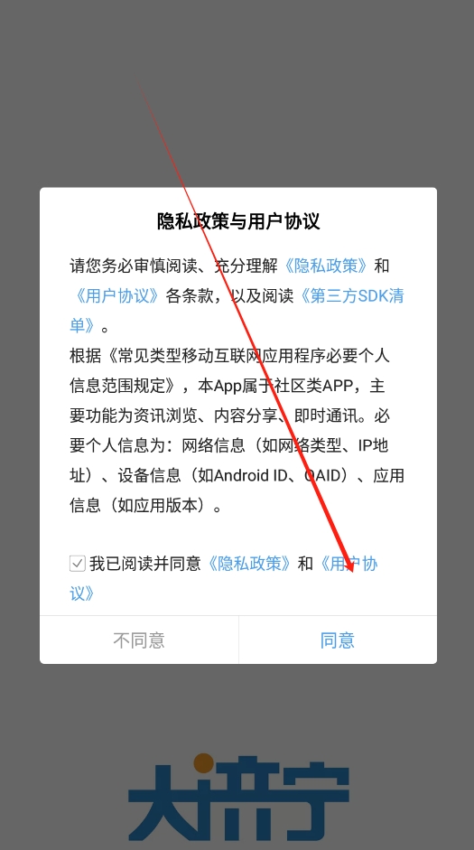 1、打开大济宁app端以后,阅读隐私政策与用户协议进入。