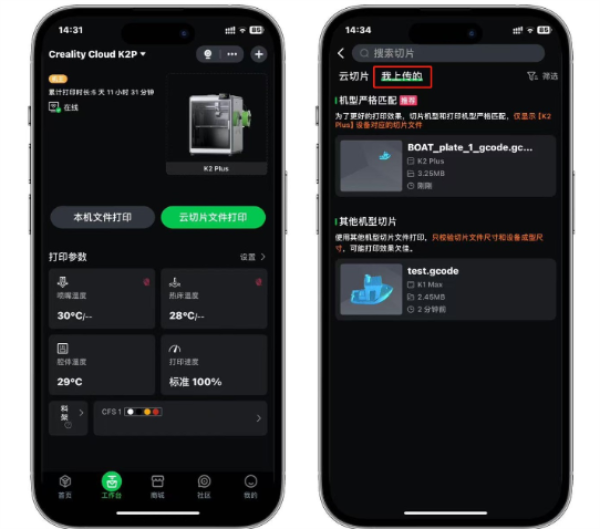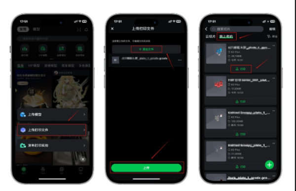 1、打开创想云App,点击首页右下角的”+”号,随后点击”上传打印文件”,点击“添加文件”将本地G-code上传,完成上传后即可在“我上传的"中找到对应的模型文件,最后点击“打印"即可发送打印任务。