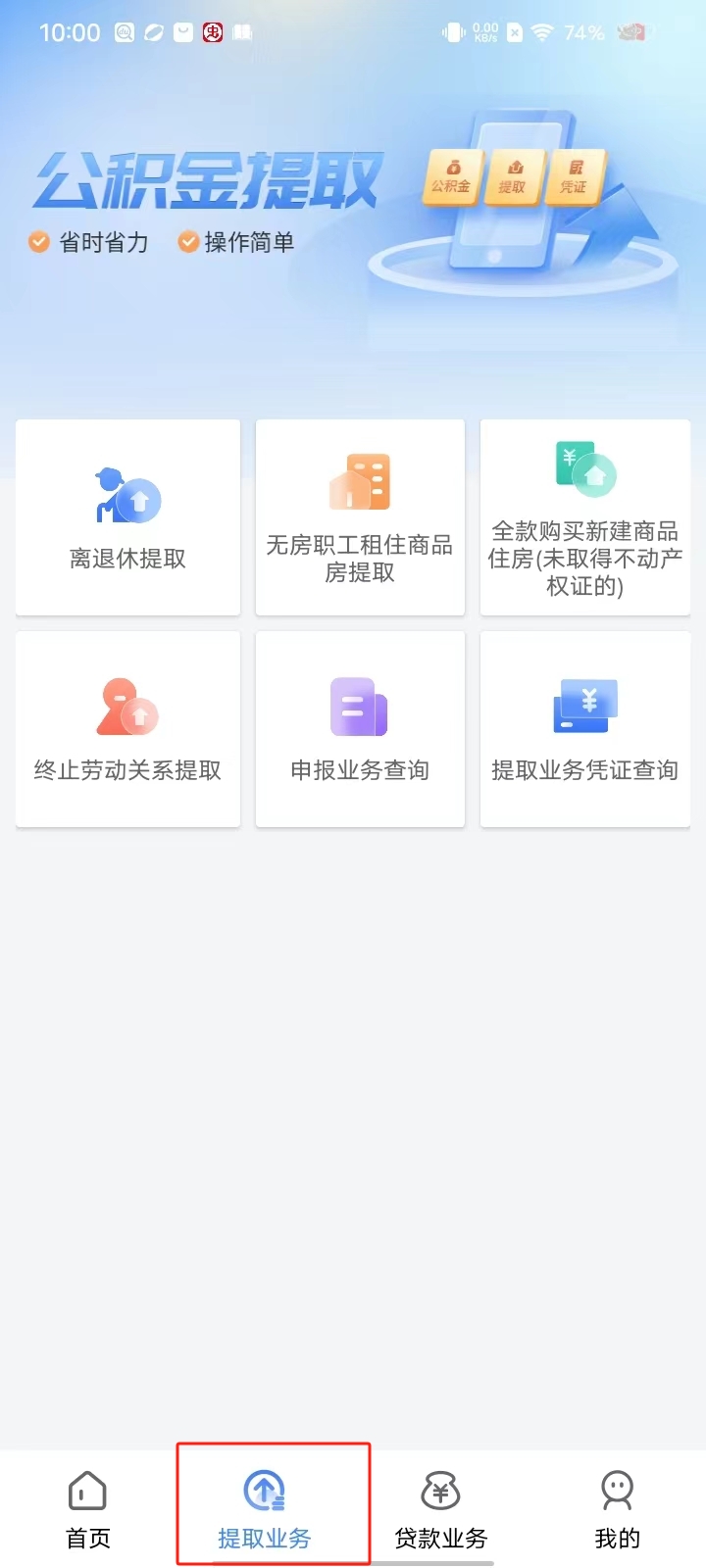 2、成功登录以后,点击下方导航栏中的【提取业务】,会有离退休提取、无房职工租住商品房提取、全款购房提取、终止劳动关系提取等,用户可以根据自身情况进行选择;