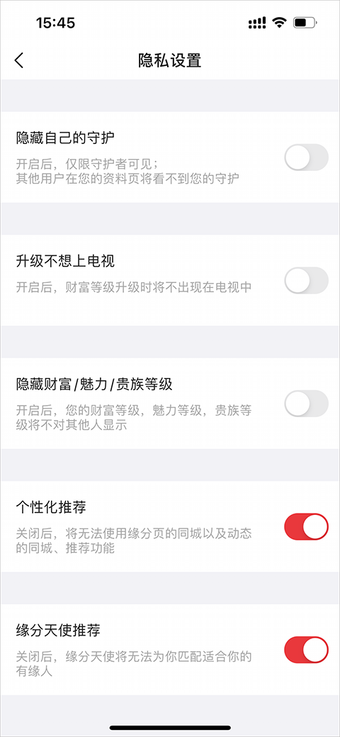 4、隐私设置界面点击“隐藏自已的守护”后面的圆点