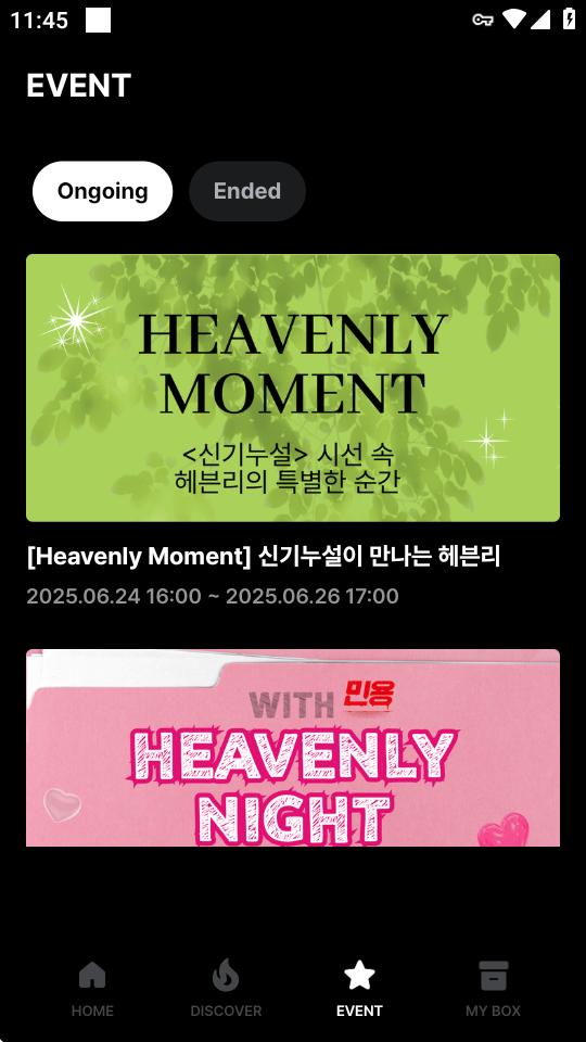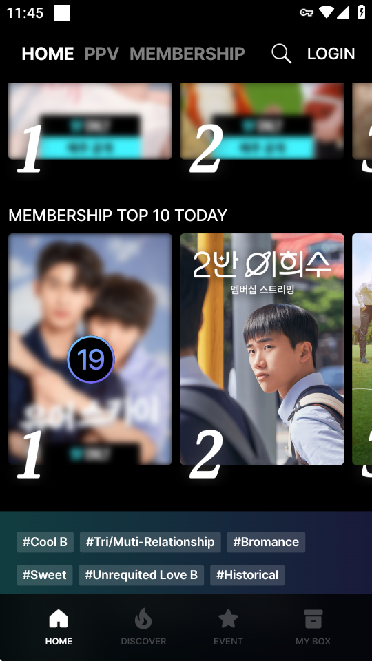 2、登录后,通过底部导航栏访问不同的内容区域,如“HOME”查看推荐内容,“DISCOVER”发现新作品,“EVENT”查看活动信息,“MYBOX”管理个人收藏。