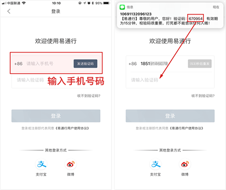2、查看手机短信后,将收到的验证码输入到“请输入验证码”文本框内,点击“登录”按钮,登录成功。(用户不主动退出账号,易通行APP将持续保持登录成功状态)。