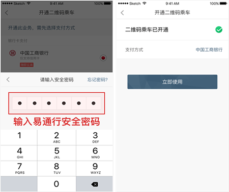 3、乘客转到二维码乘车确认开通页,点击“确认开通”按钮,输入第三方支付密码,开通成功。