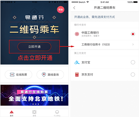 登录易通行APP,在首页点击“立即开通”按钮,跳转到二维码乘车支付渠道选择页。