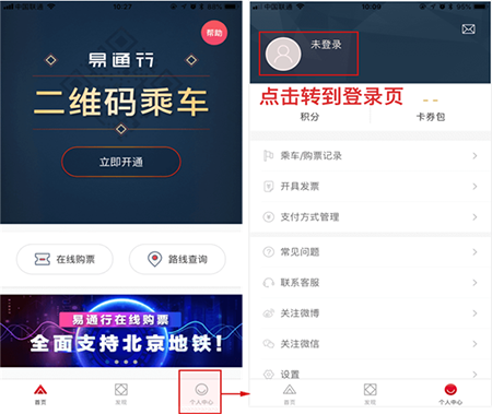 打开“易通行”APP,点击“个人中心-未登录”,跳转到登录页。