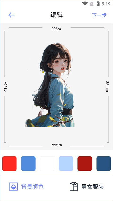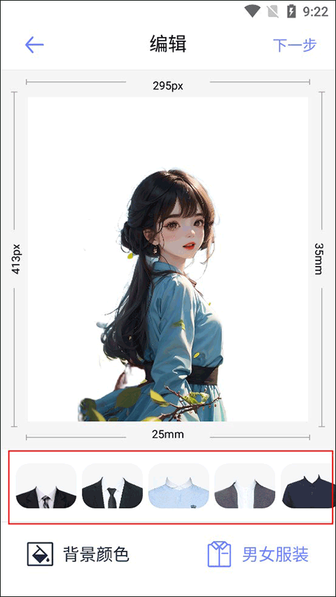 拍好或者选好图片后我们就需要对照片进行一个编辑,如果要求是要红背景也可以通过这个进行调整,如果你觉得你的衣服不够正式也可以通过下面的男女服装进行调整,调整好了我们就点击下一步。