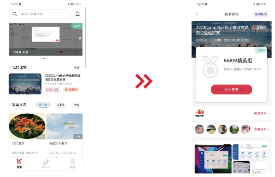 2.1实名信息保存后点击首页“我的比赛”区域,点击您报名的赛事,进入组别选择页