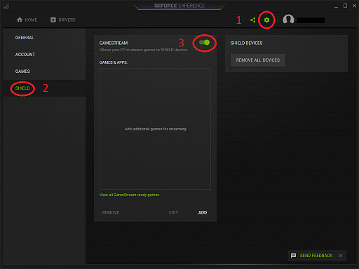3、然后手动开启「GAMESTREAM」的开关。如果你在驱动里没有找到「SHIELD」这个选项,可能是你的显卡比较老旧并不支持该功能,串流要求至少 GTX600 以上。