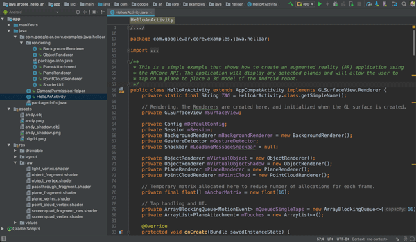 借助 hello_ar_java 应用,您可以在检测到的 AR 平面上放置一个三维 ARCore 典当。它通过 Android GL SurfaceView 实现,Android GL SurfaceView 用于渲染相机预览和基本 AR 对象,例如平面和锚点。可以在 com/google/ar/core/examples/java/common/samplerender 中找到 hello_ar_java 的示例渲染框架。