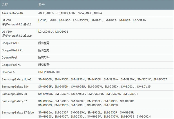 ARCore 可以在运行 Android 7.0 (Nougat) 及更高版本系统的多种符合资格的 Android 手机上使用。 在开发者预览版期间,ARCore 支持以下设备(如下图)