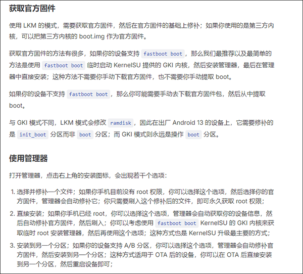 打开管理器后,你可以在首页看到设备当前运行的模式;注意 GKI 模式的优先级高于 LKM,如你既使用 GKI 内核替换掉了原有的内核,又使用 LKM 的方式修补了 GKI 内核,那么 LKM 会被忽略,设备将永远以 GKI 的模式运行。