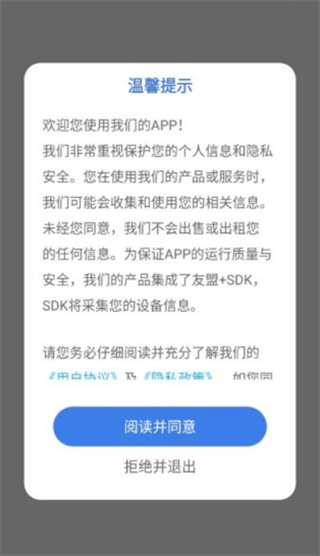 1、打开软件,阅读用户协议和隐私政策,点击同意并接受即可进入下一步。