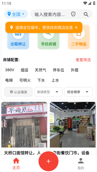4、开启位置权限就可以查看自己所在城市的商铺信息,还可以发布转让信息。