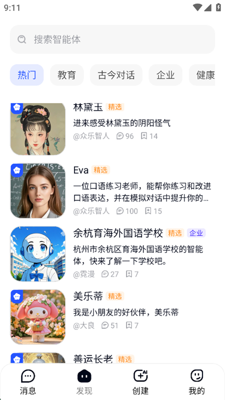 3、可以直接在搜索框输入智能体名称,点击进入即可开启对话聊天