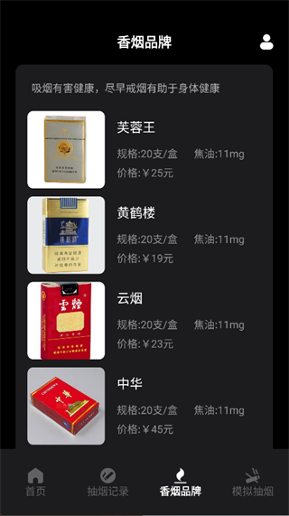 4、香烟品牌库:支持多种香烟品牌信息录入,包括价格、焦油量等,方便记录。