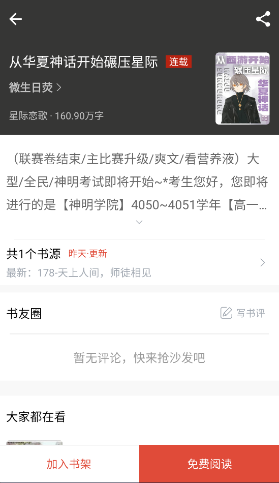 2、点击喜欢的小说,即可进入详情页,可以将小说加入书架,也可以点击右下角的免费阅读开始阅读