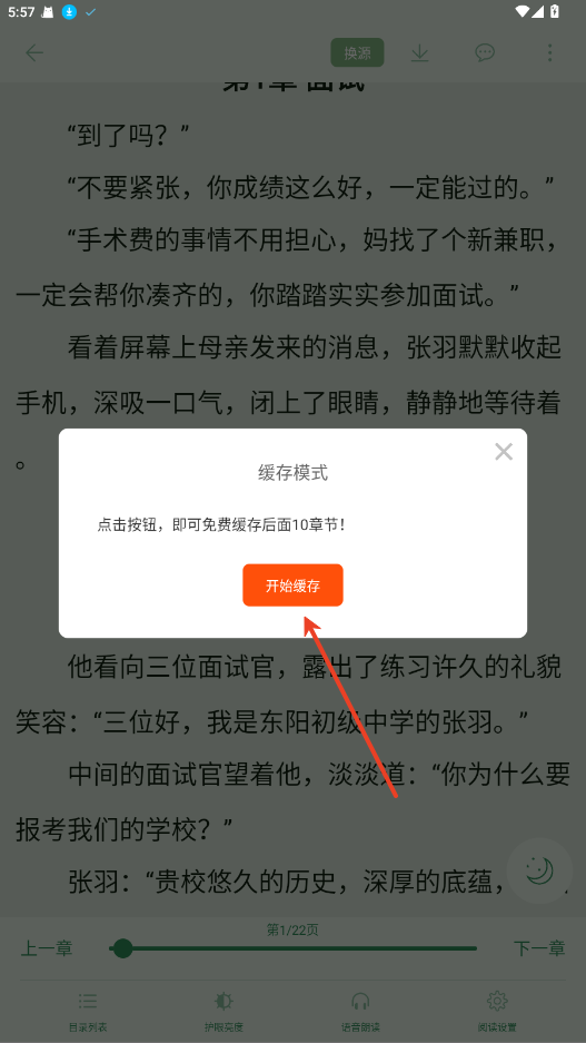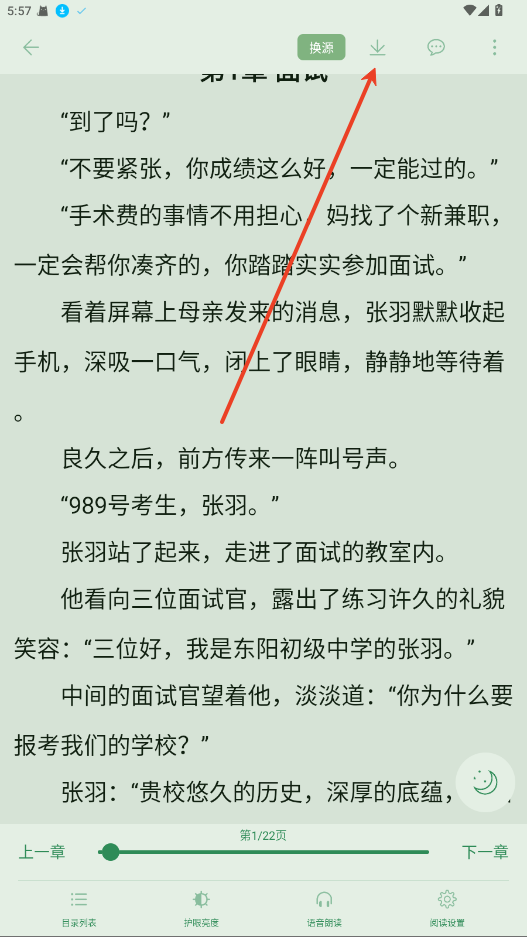 4、在阅读界面,点击任意位置,就可以看到最上方有换源、下载按钮,最下方有目录、听书、阅读设置等功能,点击即可使用