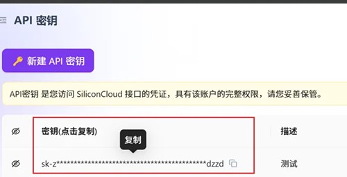 3、新建成功后我们把鼠标移动到密钥位置 点击复制即可。
